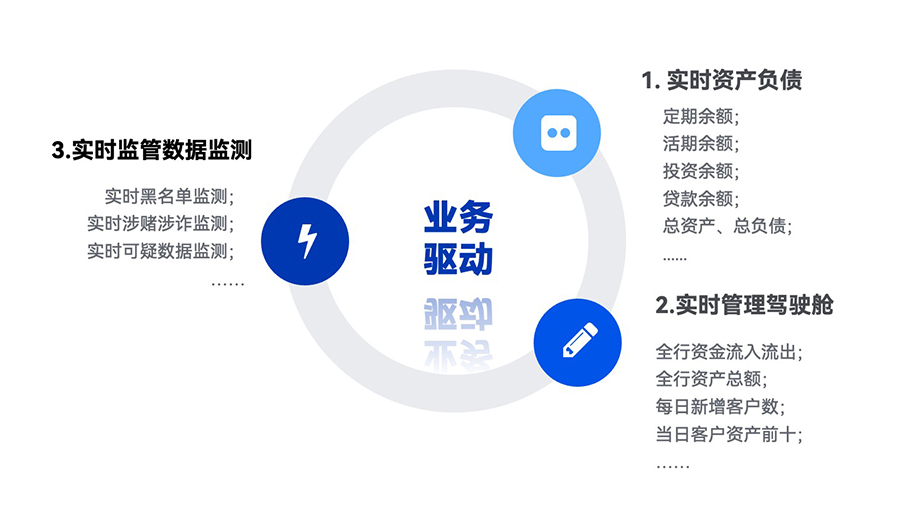 場景二:實(shí)時(shí)管理駕駛艙:通過實(shí)時(shí)獲取交易動賬,對全行級別的資金流入流出金額、客戶資產(chǎn)、申貸金額及人數(shù)等指標(biāo)進(jìn)行實(shí)時(shí)展示;