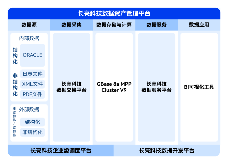 能力共進,推出金融數(shù)據(jù)倉庫聯(lián)合方案 雙方早已在產(chǎn)品適配認證上提前布局,長亮科技數(shù)據(jù)倉庫解決方案與南大通用GBase 8a MPP Cluster V9已完成聯(lián)合測試,雙方產(chǎn)品完全兼容、運行穩(wěn)定,充分滿足金融機構數(shù)據(jù)倉庫的建設需求。 綜合雙方在各自領域的創(chuàng)新優(yōu)勢,該聯(lián)合解決方案以南大通用GBase 8a MPP Cluster V9為核心構件,輔以長亮科技數(shù)據(jù)開發(fā)平臺、數(shù)據(jù)交換平臺、企業(yè)級調度平臺、數(shù)據(jù)資產(chǎn)管理平臺、數(shù)據(jù)服務平臺,打造海量數(shù)據(jù)計算及復雜模型分析的技術平臺,實現(xiàn)跨業(yè)務領域數(shù)據(jù)的集中采集、存儲和共享,全面、及時、準確展現(xiàn)關鍵系統(tǒng)的運行狀況與趨勢,助力金融機構全面挖掘數(shù)據(jù)價值。 數(shù)據(jù)倉庫及其上下游系統(tǒng)邏輯關系圖 系統(tǒng)技術架構圖