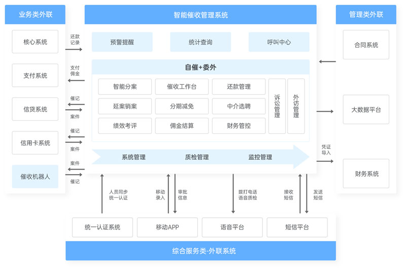 運用先進的動態(tài)評分及風險定價模型、多級智能策略、大語言模型等人工智能技術,以案件管控為導向,以提高催收效率和合規(guī)催收作業(yè)為雙目標,從金融行業(yè)不良資產(chǎn)催收處置全流程出發(fā),實現(xiàn)業(yè)務和管理的結構化、流程化、精細化、標準化、智能化,達到防范化解經(jīng)營風險、規(guī)范業(yè)務操作、輔助管理決策、提高工作效率、促進業(yè)務發(fā)展、降低管理成本、提高催收效益的目的。
