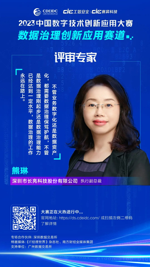 本次大賽是面向全社會公開的全國性賽事,深圳市長亮科技股份有限公司執(zhí)行副總裁熊琳將作為本次大賽評審專家,圍繞數(shù)據(jù)治理能力提升方案、數(shù)據(jù)治理創(chuàng)新產(chǎn)品技術(shù)兩個賽題方向,對參賽作品進行評審選拔,敬請期待!