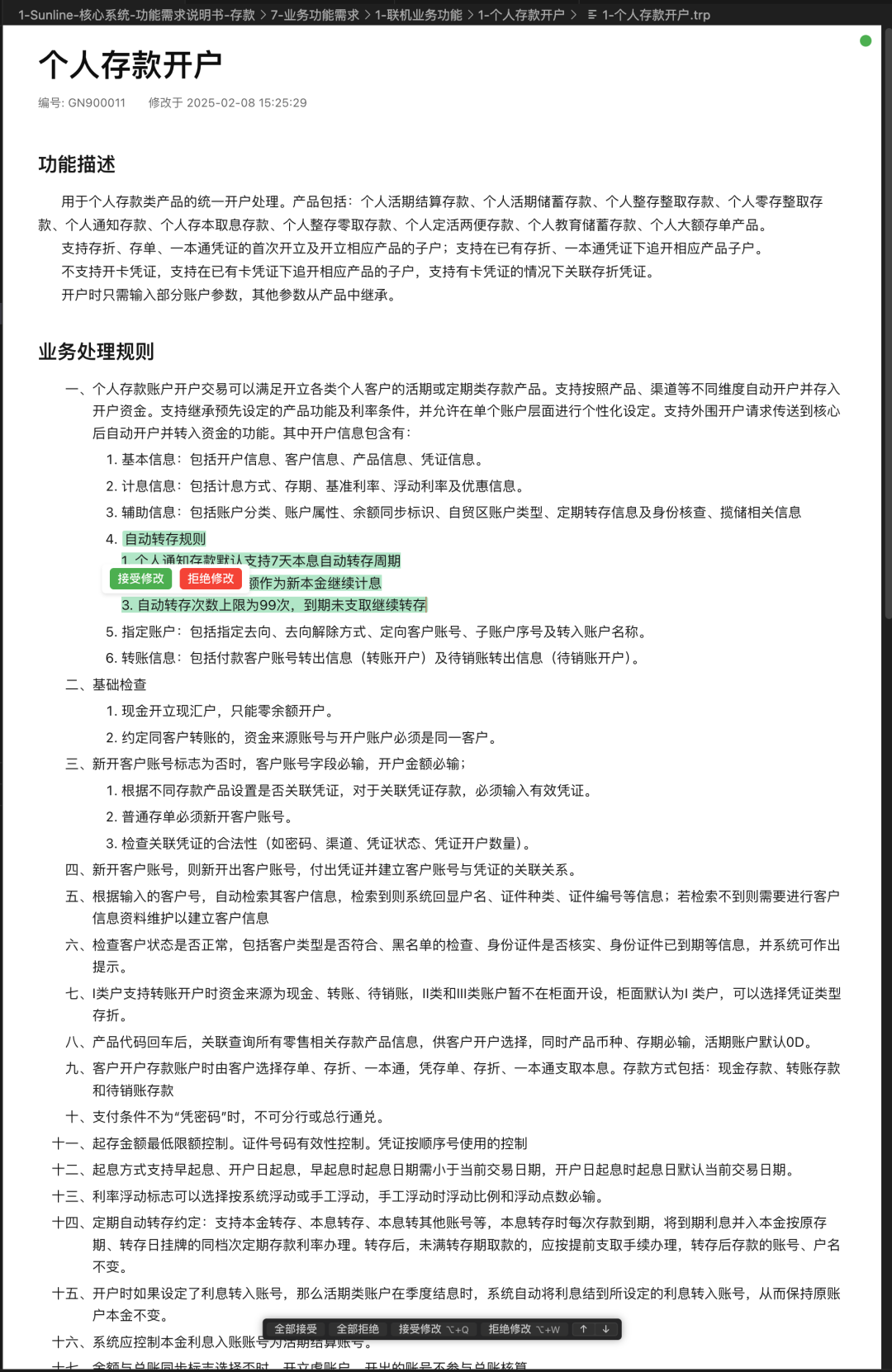 a. 智能標注:基于對需求變更內容的理解,AutoBA 自動完成需求改寫,并在需求文檔中以色塊形式標注修改內容