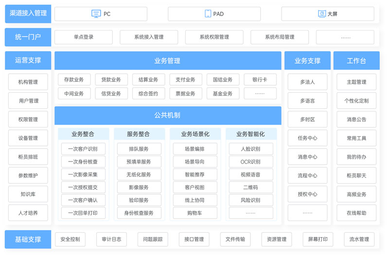定位于面向場景設(shè)計的、能夠支撐銀行網(wǎng)點(diǎn)一體化信息建設(shè)的新型應(yīng)用平臺,設(shè)計上以客戶為中心,以智能化、高效運(yùn)營、業(yè)務(wù)統(tǒng)一化為目標(biāo),同時整合網(wǎng)點(diǎn)內(nèi)外所有人、設(shè)備和系統(tǒng),將業(yè)務(wù)流程打通,面向客戶進(jìn)行數(shù)據(jù)共享,做到一次識別、一次驗證、一次確認(rèn)、一次打印,助力銀行提高客戶體驗度、提升柜員作業(yè)效率、降低網(wǎng)點(diǎn)操作風(fēng)險,全面提升網(wǎng)點(diǎn)的營銷能力和服務(wù)能力。