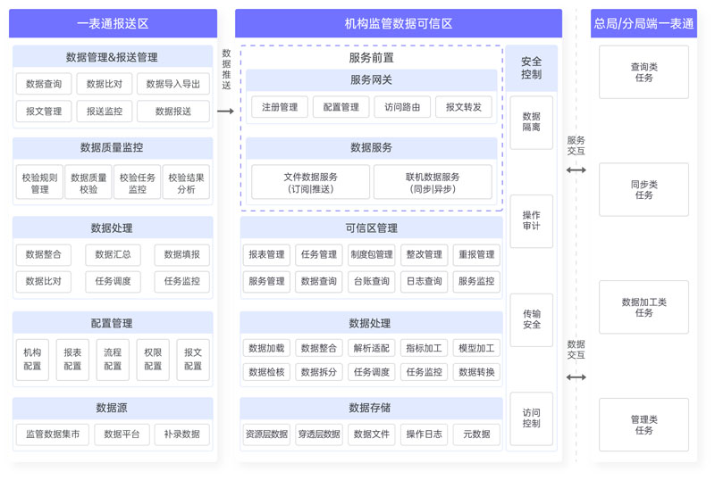 “一表通”作為長亮科技統一監管報送平臺子系統,繼承了傳統報送模塊各類功能,包括統一的機構管理、權限管理、菜單管理、數據管理、報表管理、數據質量監控、配置管理、報送管理等,并涵蓋了符合監管建設規范要求的可信區系統,系統支持多法人,內置完善的校驗規則并提供可配置管理功能,對監管數據進行多級校驗,全面提升報送數據質量,助力金融機構高效完成監管報送工作,降低合規風險。