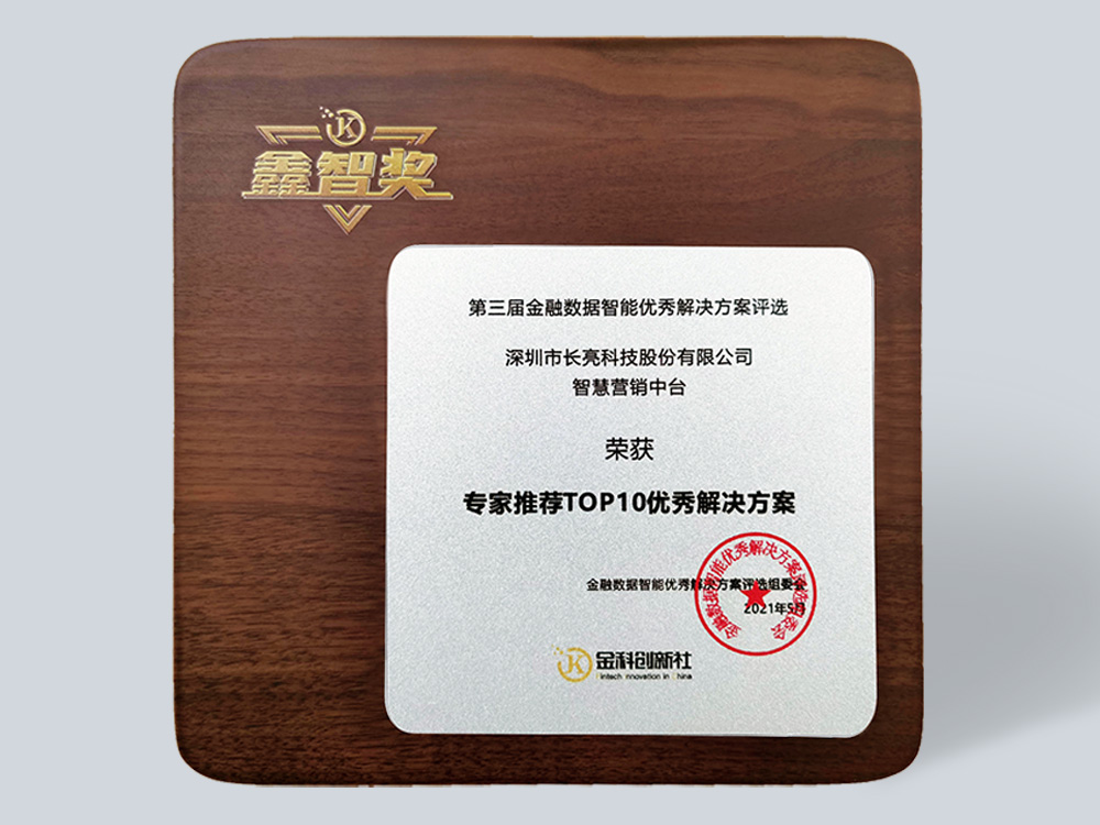 經過5場線上答辯,以及來自國家科技評估中心、中國人民銀行以及銀行、保險、證券、基金等金融機構的52位評審專家和陪審專家兩輪打分、點評,長亮科技智慧營銷中臺憑借在數據標簽、畫像、算法模型、營銷活動、營銷模板等方面的先進性與成熟性,獲得“專家推薦TOP10優秀解決方案”、“營銷創新優秀解決方案”兩項大獎。