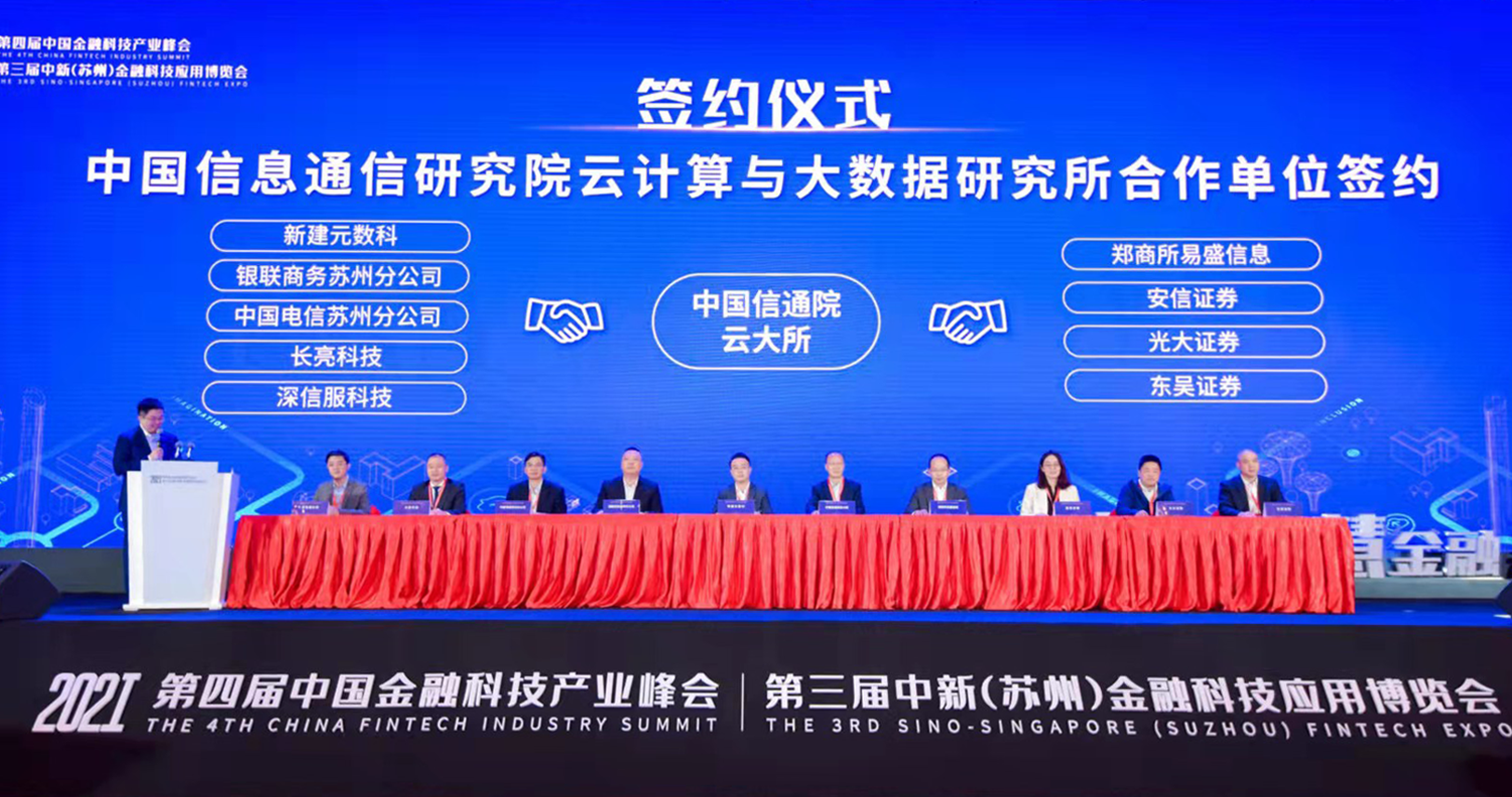 2021年10月28日至30日,第四屆中國(guó)金融科技產(chǎn)業(yè)峰會(huì)暨第三屆中新(蘇州)金融科技應(yīng)用博覽會(huì)在蘇州舉辦。會(huì)上,長(zhǎng)亮科技成為中國(guó)信息通信研究院云計(jì)算與大數(shù)據(jù)研究所(簡(jiǎn)稱:中國(guó)信通院云大所)的合作單位之一,長(zhǎng)亮科技總裁助理孫世勝、中國(guó)信通院云大所所長(zhǎng)何寶宏代表雙方簽署業(yè)務(wù)合作協(xié)議。